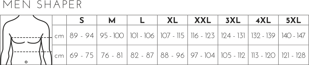 Aby dobrać rozmiar należy dokonać pomiaru obwodu w pasie oraz obwodu klatki piersiowej, a następnie odszukać pomiary w poniższej tabeli i dobrać rozmiar od S do 5XL. Uwaga! W przypadku gdy pomiary wypadają na granicy dwóch rozmiarów zalecamy wybór rozmiaru większego z uwagi na intensywną kompresję produktu!